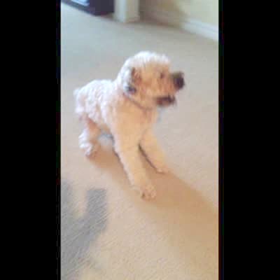 Man (filming) asks white fluffy dog if he had a good dinner. Dog burps loudly.