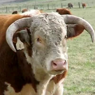 Bull moves in a field and sounds like it's singing.