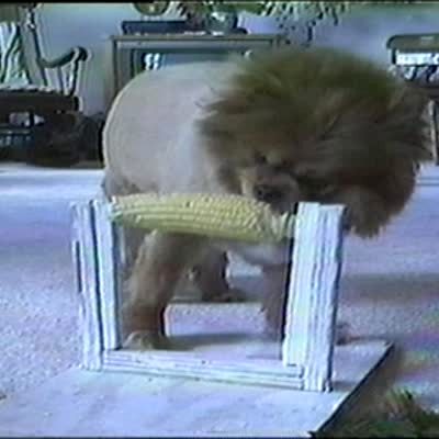 Man puts hands through a shirt with a dog's head sticking out of the neck collar and feeds the sheep dog with a spoon. Looks like a dog with human hands.