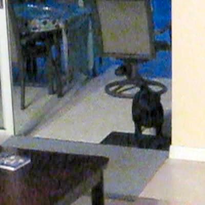 A woodpecker bird pecks a doorbell outside of a house, then it flies away, and a teen boy comes out of the house and looks around. Security footage.