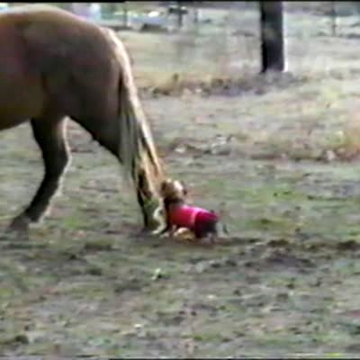 Silky terrier dog bites horse's tail, is dragged around field