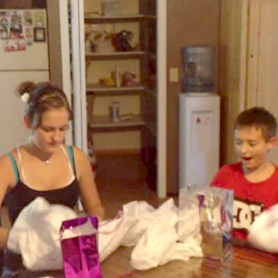 Teen girl and young boy open packages from their parents. The gifts are shirts that announce their parents are having another kid. They both get upset. Boy walks away.