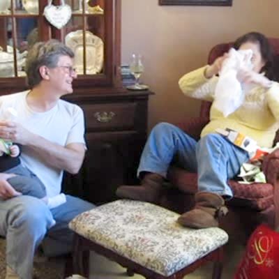 "Ultrashocking Ultrasound" A man and a woman open a gift on Christmas and find out they're going to be grandparents again. The woman stands up and walks slowly to the camera. pregnant.