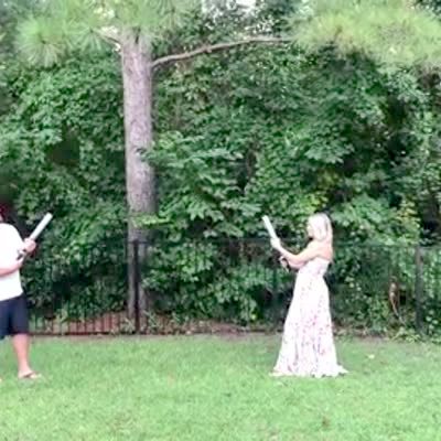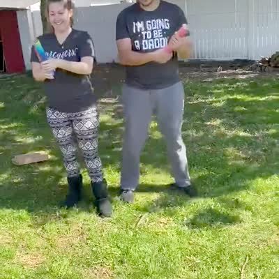 A man and woman shoot confetti powder cannons in the yard for a gender reveal and the man gets hit in the groin.