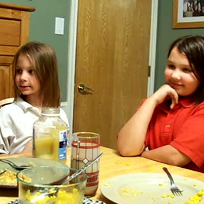 At a dining room table, a woman tells a girl and a young girl that she is pregnant and they are going to have a baby brother or sister. The older girl smiles and stands up, excited. The younger girl dances around and sings 'Uh uh, let's party. She shakes her butt and excitedly cheers about having a baby sister. She excitedly screams about having an extra baby sitter. Finally, the older girl carries her out of the room. Very cute and chaotic. Long clip. Action 1:30 to end.