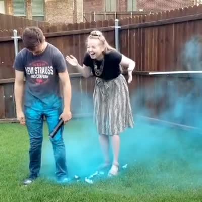 A man stands next to a woman in a yard and pulls a gender reveal cannon and it fires the wrong way and blue smoke explodes onto his pants.