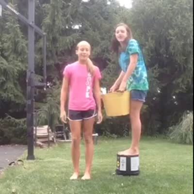 A teen girl announces her ice bucket challenge outdoors while another girl stands on a bucket next to her and dumps a bucket of water on her before the bucket she's standing on tips over and the girl falls down. ALS Ice Bucket Challenge. Vine/instagram