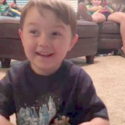 A young boy pops a gender reveal balloon in a living room with his mom and dad. The young boy looks at the pink confetti and asks "Where's the baby?"