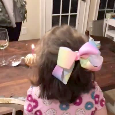 A family sings happy Birthday to a young woman in the kitchen, and a tot girl says she pooped.