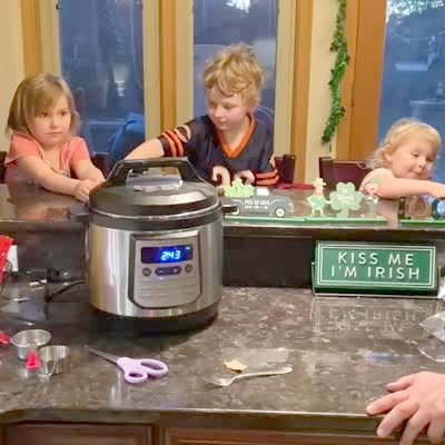A woman opens the oven door and says, "There is a bun in the oven?" Then she realizes she will be a grandmother.