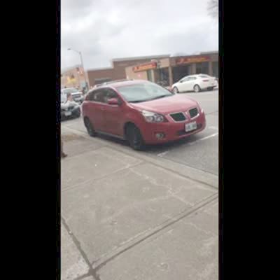A woman records a video while she walks down the sidewalk to a parked car that honks its horn. She goes up to the window and sees a dog in the driver seat with its paw on the horn.