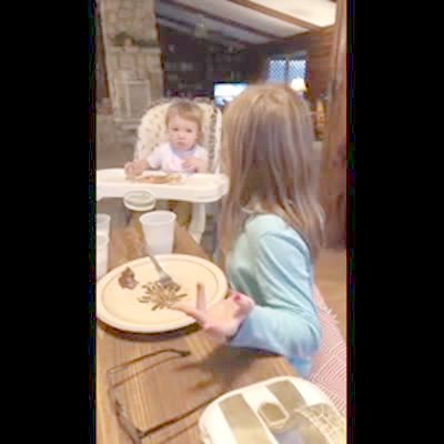 A tot girl repeatedly says the word "deer" as she sits in a high chair at a dining room table. Her older sister gets upset and tells her there are no deer, but she says it again.
