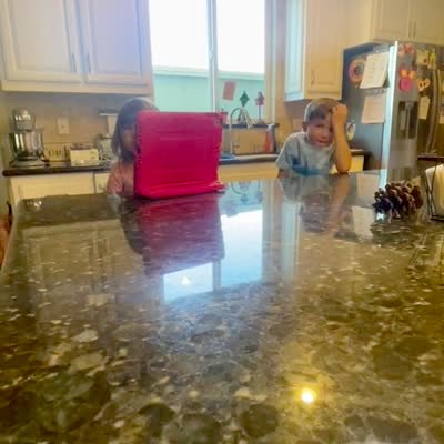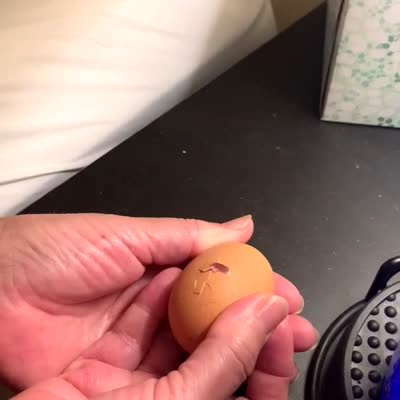 A young girl shows her mother a bouncy egg she made in the kitchen, and the egg explodes in her hand.