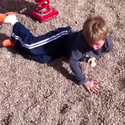 At 0:06, a boy jumps off of a springy seat at playground and falls harder than he anticipated.