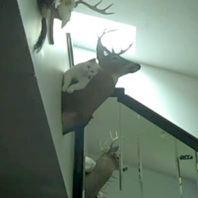 A white cat lies on a stuffed deer head mounted on a living room wall. The deer head rotates, tipping over, and the cat falls off and down to the floor. It lands on its feet. Short tails. Animals.