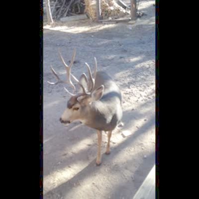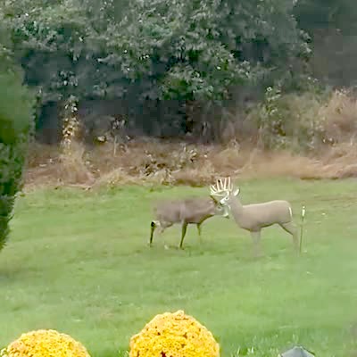 A real buck charges and attacks a fake buck in a backyard and then runs away.