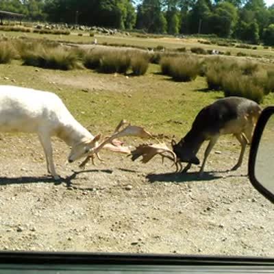 A man records a video out a car window of two elk while they wrestle at a drive through safari and then a buffalo suddenly steps in front of the window and everyone gets scared.