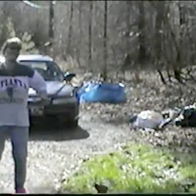 A deer gets its head stuck in a bag and runs into objects all around a yard as a man tries to help it.