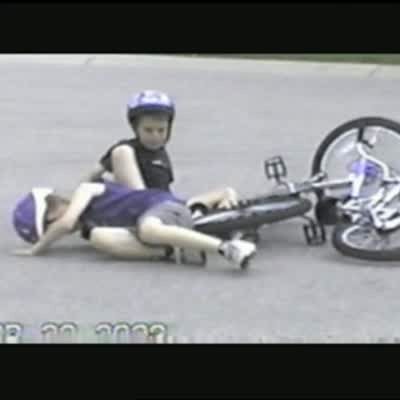 2 young boys on bicycles crash into each other & fall over. They both cry. With recovery.