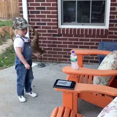 A young girl flips a bottle of water onto the arm of a patio chair and cheers.