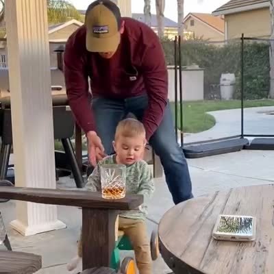 A tot boy rides a toy car in the backyard, looks at a drink on the arm of a patio chair and hits it onto the ground, then his father stares and says, "Dang son."