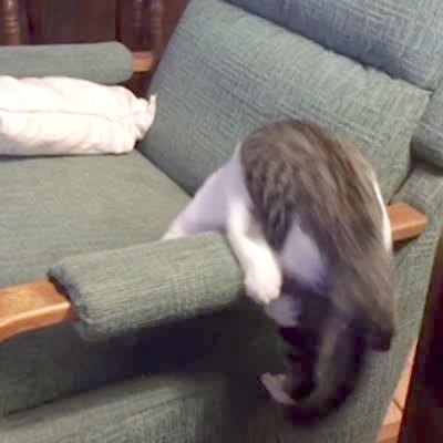 Man wearing Santa hat tries to do handstand on arms of easy chair, flips over and falls to floor. Bonehead. Christmas.
