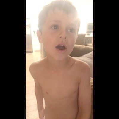 A young boy tells his mom that he cut hair from his head and glued it to his armpit. He then lifts his arm and shows her the hair.