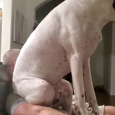 A large dog tries to sit on a man's shoulder in an armchair in a living room.