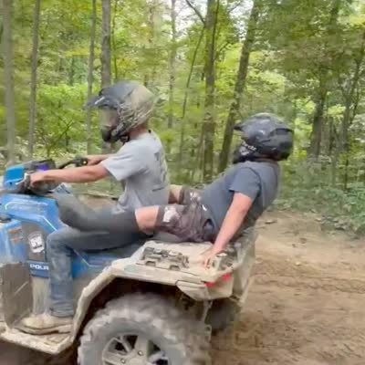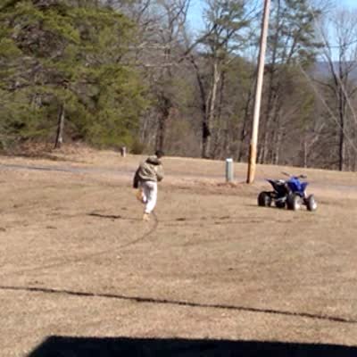 A man holds on to the front of an ATV while his friend drives it backwards in circles.