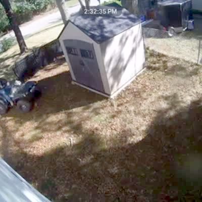 A man rides a four-wheeler ATV and crashes into a garage offscreen. Security footage.