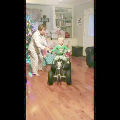 A tot boy rides a motorized toy ATV car in a house and his tot boy brother chases him and their family laughs. He drives into a glass kitchen stove and it shatters and breaks.