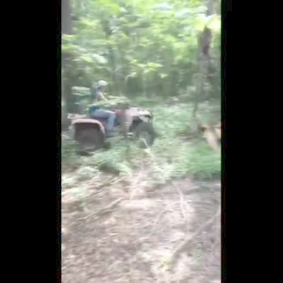 A man drives an ATV through the woods into a tree and uses it to knock it down, and then the tree falls down and hits the man on the head.