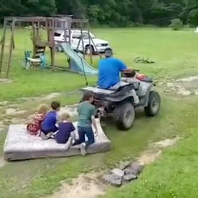 Four kids sit on a mattress tied to an ATV. A man drives the ATV forward until the mattress suddenly stops and all four children fall forward off the mattress.