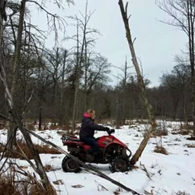 A woman hits a dead tree with an ATV. The tree breaks and falls on the woman's head.