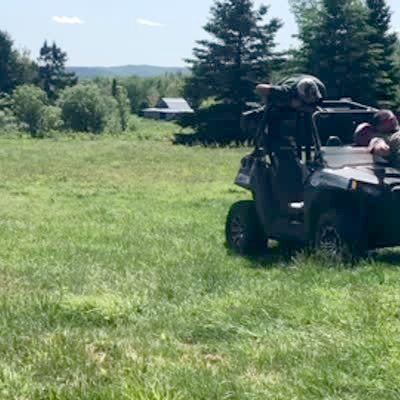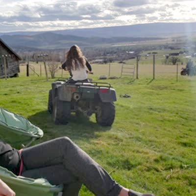 A teen boy and girl drive a four wheeler in a field and tow a teenage girl in a kayak across a lake. The kayak slides out of the water into the field and the teen girls falls out of the kayak onto the grass.
