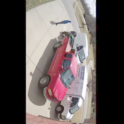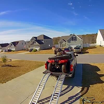 A man attempts to reverse his four-wheeler from a trailer onto the back of a truck when one of the ramps falls and he and the four-wheeler topple off to the driveway. Security footage.