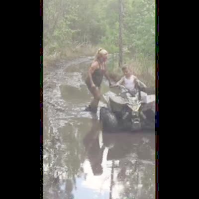 A woman tries to push an ATV that a young boy drives in muddy water. The young boy keeps accelerating and mud drenches his mom. Quad. Stream, ravine, creek.