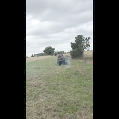 A teen girl and teen boy work on an ATV together outside. The ATV suddenly drives off at full speed with no one on it and the boyfriend chases after it. Security Footage.