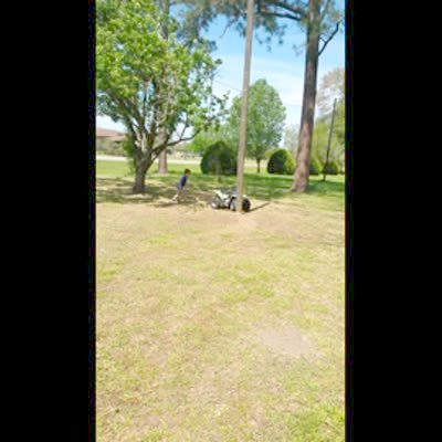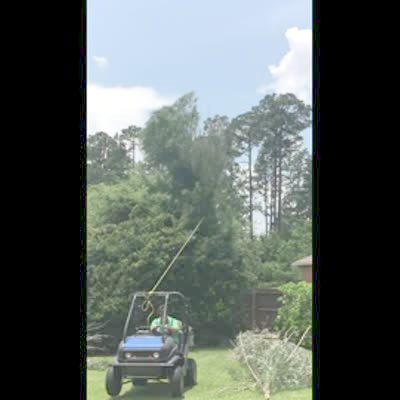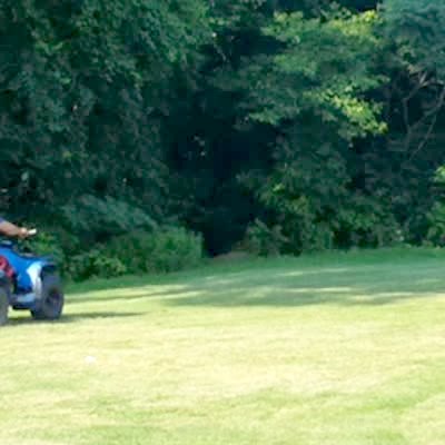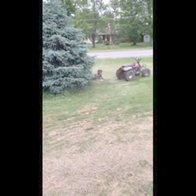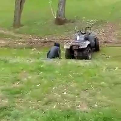 A man drives an ATV attached to a tree with a band. A tree branch snaps over his head in a yard.