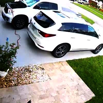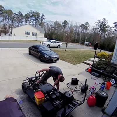 A man revs up the engine on an ATV and loses control of it, and then he chases it as it drives into a house across the street. Security footage.
