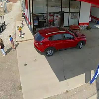 A teen boy gets off of an ATV and it takes off and crashes into a van. Security footage.