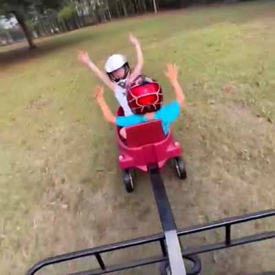 In the backyard, a woman drives an ATV hooked to a wagon with a young boy and girl. The woman drives all over the lawn until she takes a sharp turn and the wagon tips over and the children fall out.