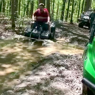 A man and woman drive an ATV into a mud puddle, and it sinks almost entirely under the water. Featured talent cleared only (the man and woman on the ATV who sink into the mud).