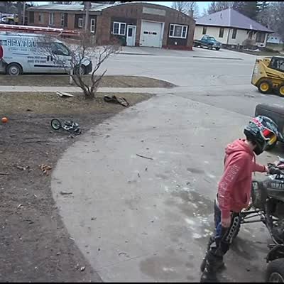 A young boy does not turn off an ATV and it drives over another young boy, who the first boy is chasing. No recovery. Could be Forbidden.