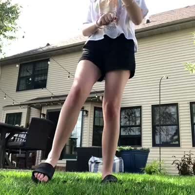 A young girl dances to music in a yard, then her young boy brother crashes into her with a four wheeler vehicle and knocks her over. Music not covered.