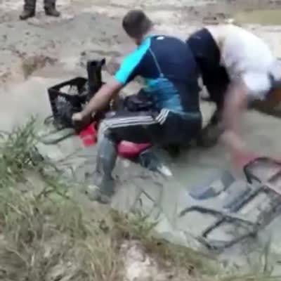 A man falls face first into muddy water as he tries to help another man stuck on an ATV in the water outdoors.