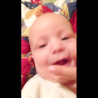 A baby boy farts suddenly while his mother runs her finger back and forth over his mouth at home.