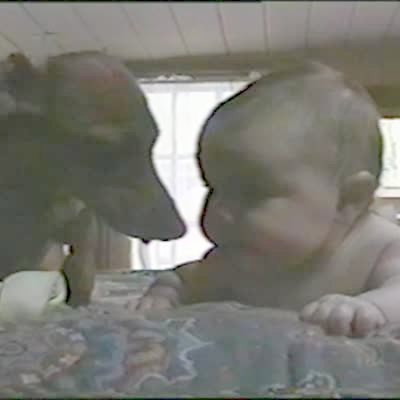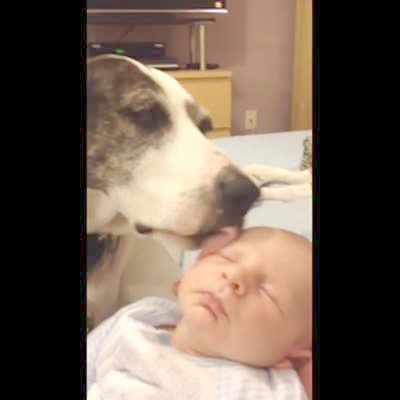 A black and white dog licks a baby boy's face and head as he sleeps.