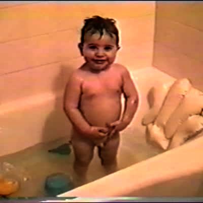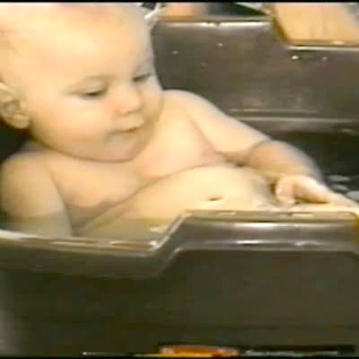 Little girl & tot boy are covered in bubbles in bath tub. Boy slips / falls under & disappears, then stands up opening his mouth wide. Short tail.