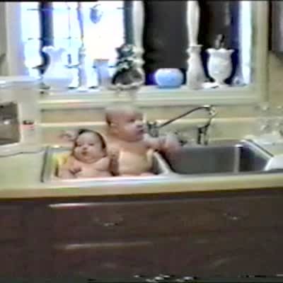 Squished baby bath: 2 babies bathe in a sink, very good visual.